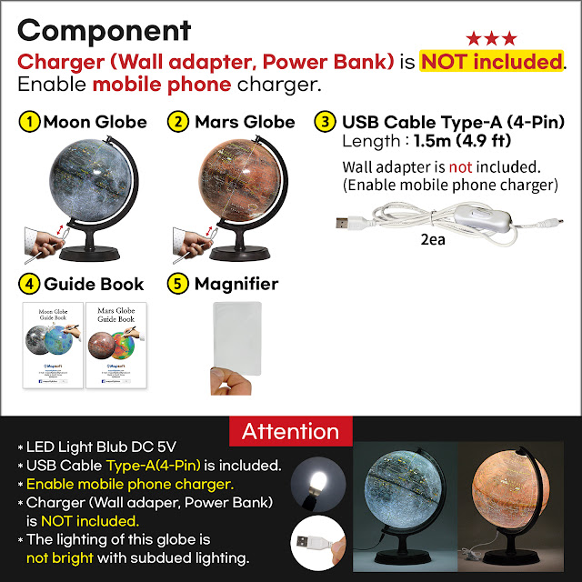 * Name : Explorer Illuminated Gray Moon/Red Mars 2 Globe Set, 24cm/9.5" * Model No. : 2MRI-24 * Bar Code (GTIN-13) : 880932577948 * Item Size : D 24cm X H 36cm X W 26cm / 9.5"D X 14"H X 10"W / Diameter X Height X Width * Shipping Size : 52cm X 34cm X 26cm / 21"L X 13.4"H X 10.2"W / Length X Height X Width * Item Weight : 1,920g (4.23 lbs, 67.7 oz) * Shipping Weight : 3,380g (7.5 lbs, 119 oz) * Color - Moon Globe : Gray (Moon surface) - Mars Globe : Red planet (Mars true color) * Language - Moon Globe : Latin & English (1,070 Named Places) - Mars Globe : Latin & English (600 Named Places) * Illuminated : Yes (LED Light Blub DC 5V, USB Cable Type-A is included.) * Attention !!! : Charger(Wall adapter) is not included. Enable mobile phone charger. * The lighting of this globe is not bright with subdued lighting. * Cartography : Up-to-date Map